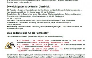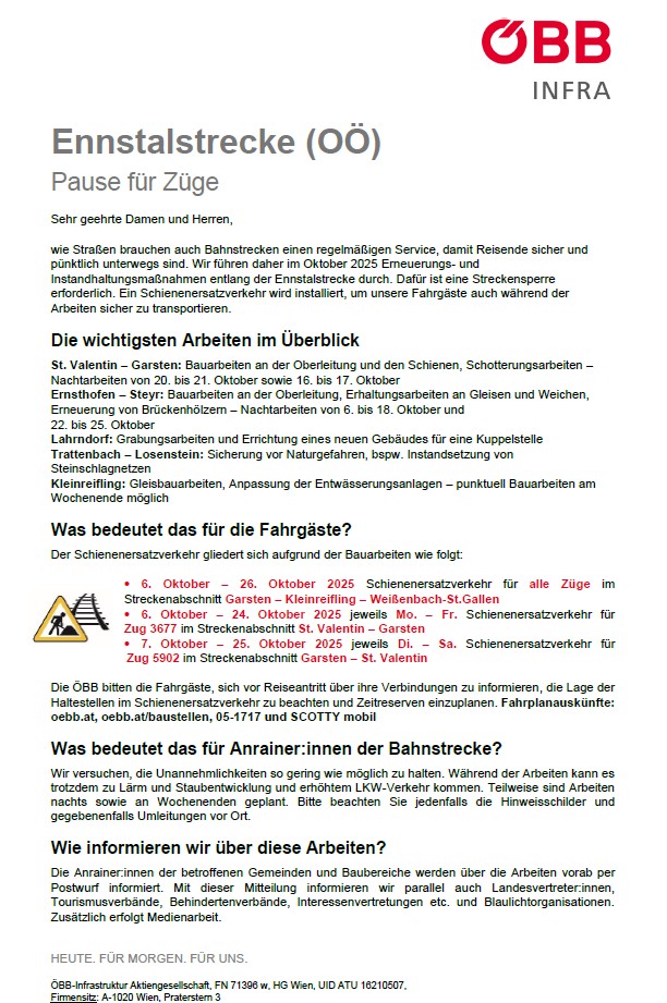 • 6. Oktober – 24. Oktober 2025 jeweils Mo. – Fr. Schienenersatzverkehr für Zug 3677 im Streckenabschnitt St. Valentin – Garsten